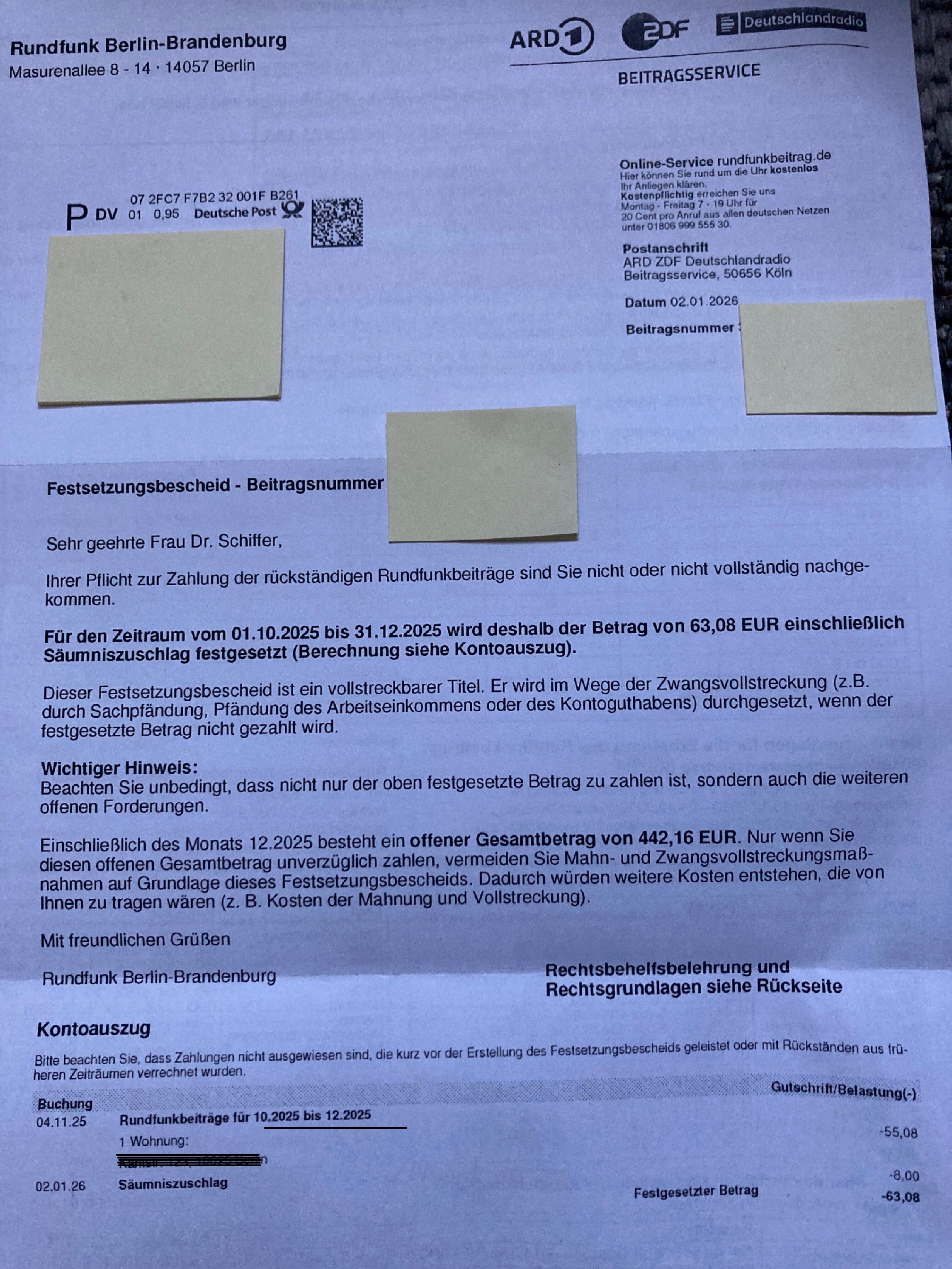 Und hier nun kann man sehen, wie die Summe der Forderungen des Beitragsservice zustande kommt. Indem man Post und Zahlungsnachweis ignoriert, wird die illegitim aufgeschlagene Mahngebühr nicht wieder zurück genommen – seit nunmehr 13 Jahren. Die Zahlen variieren jedoch ständig – wie Sie am nächsten Schreiben in Folge 3 sehen werden.