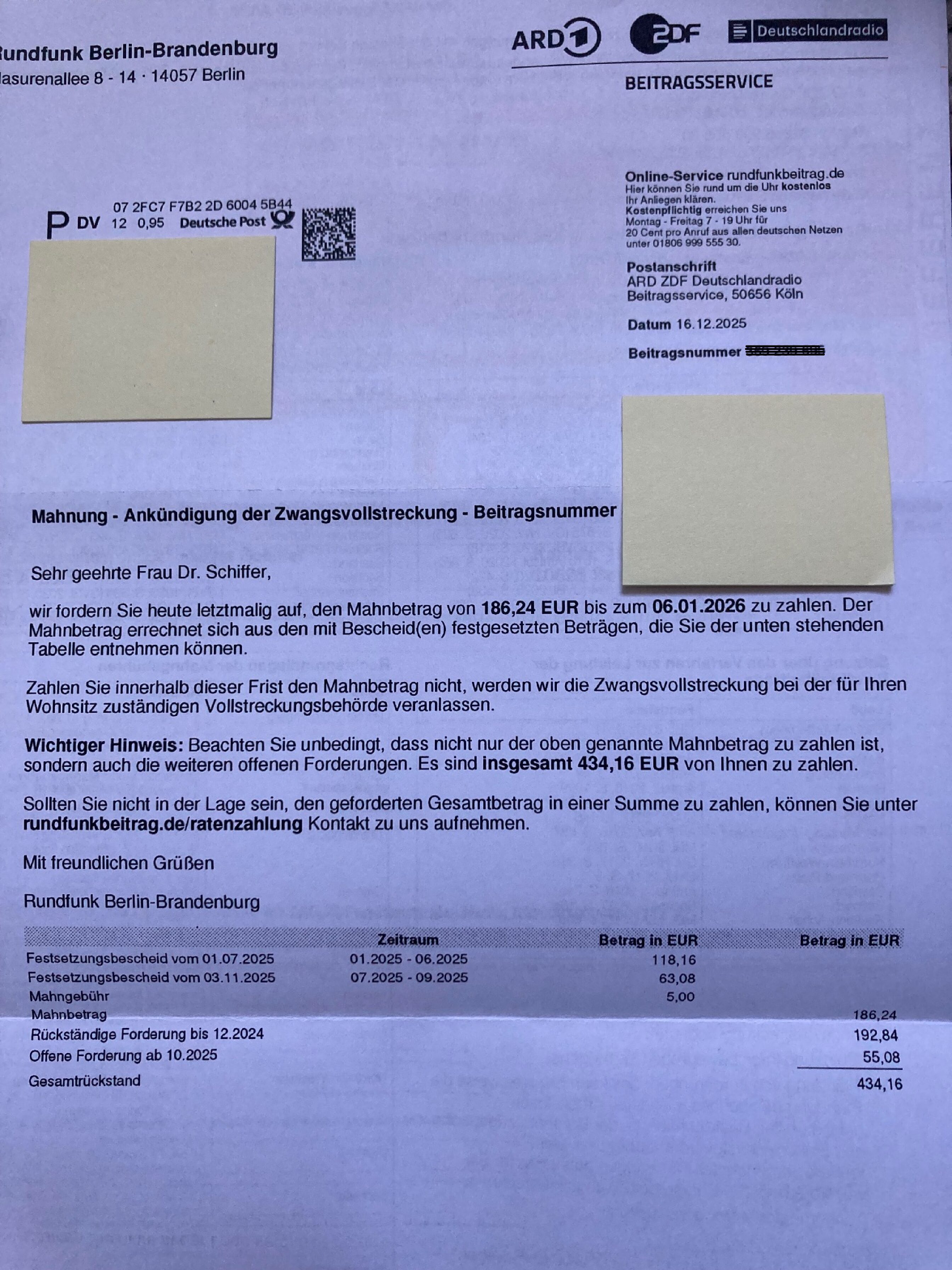 Und mit dem ersten Schreiben im neuen Jahr schickt der Beitragsservice nun einen Festsetzungsbescheid, der sich nur auf die letzten drei Monate bezieht – jedoch genauso überflüssig ist, wie der gesamte Schriftverkehr, der den Beitragszahler nun mit jedem Brief Porto in Höhe von 1,10 Euro kostet.