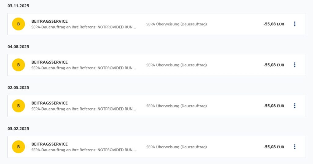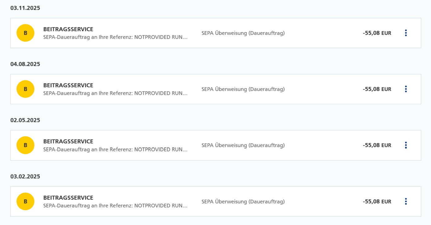 Um den Unsinn dieses Sports zu verdeutlichen, hier die Abbuchungsdaten für 2025 von meinem Privatkonto.