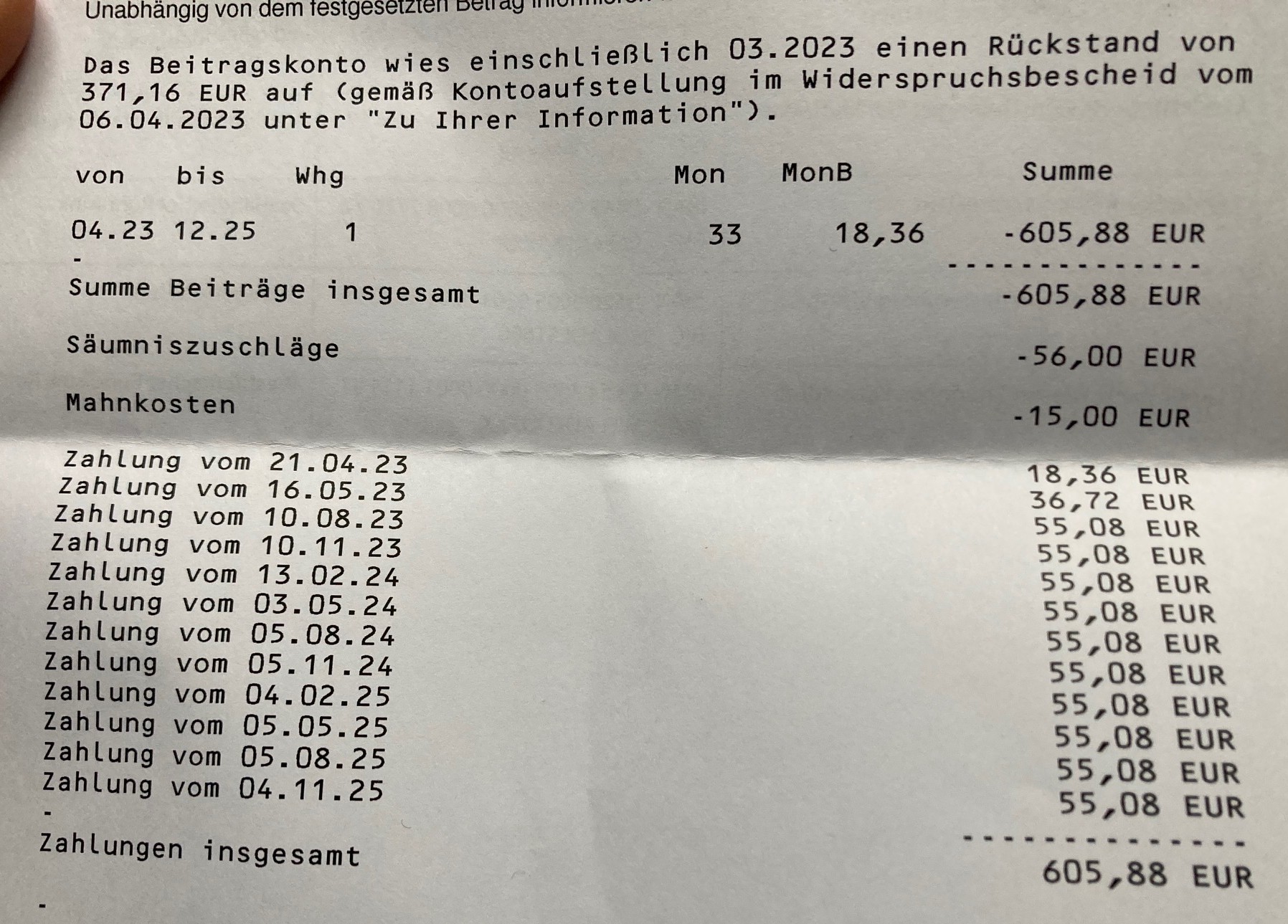 Denn im aktuellen Bescheid stellt man einerseits erneut Forderungen, deren Nichtigkeit die Auflistung der Zahlungseingänge auf dem zweiten Blatt bestätigt. Es folgt noch die Kopie eines anwaltlichen Schreibens von 2023, das die gesamten Beitragszahlungen bis einschließlich 2023 auflistet – ist etwas schwieriger zu anonymisieren, aber evtl. setzen wir damit den Fortsetzungsroman noch fort. Es bleibt jedenfalls amüsant, aber nun gibt es endlich eine Klagemöglichkeit für Sabine Schiffer.